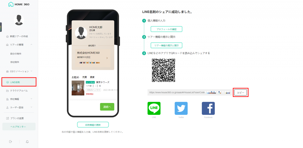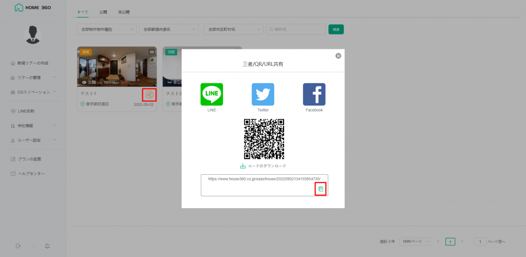コピー、QRコードのダウンロード、またはSNSへ直接投稿することができます。